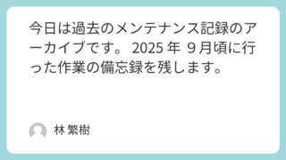 修理 今日は過去のメンテナンス記録のアーカイブです。 2025 年 9月頃に行った作業の備忘録を残します。 項目内容作業日当時の走行距離95,000 km作業内容メインバッテリー交換 作業区分DIY交換部品(あれば)パナソニック費用合計約 9,000円難易度不具合の症状・きっかけメインバッテリーが頻繁に上がってしまい、使用に耐えない。走行充電シス... 2025.09.30 修理
